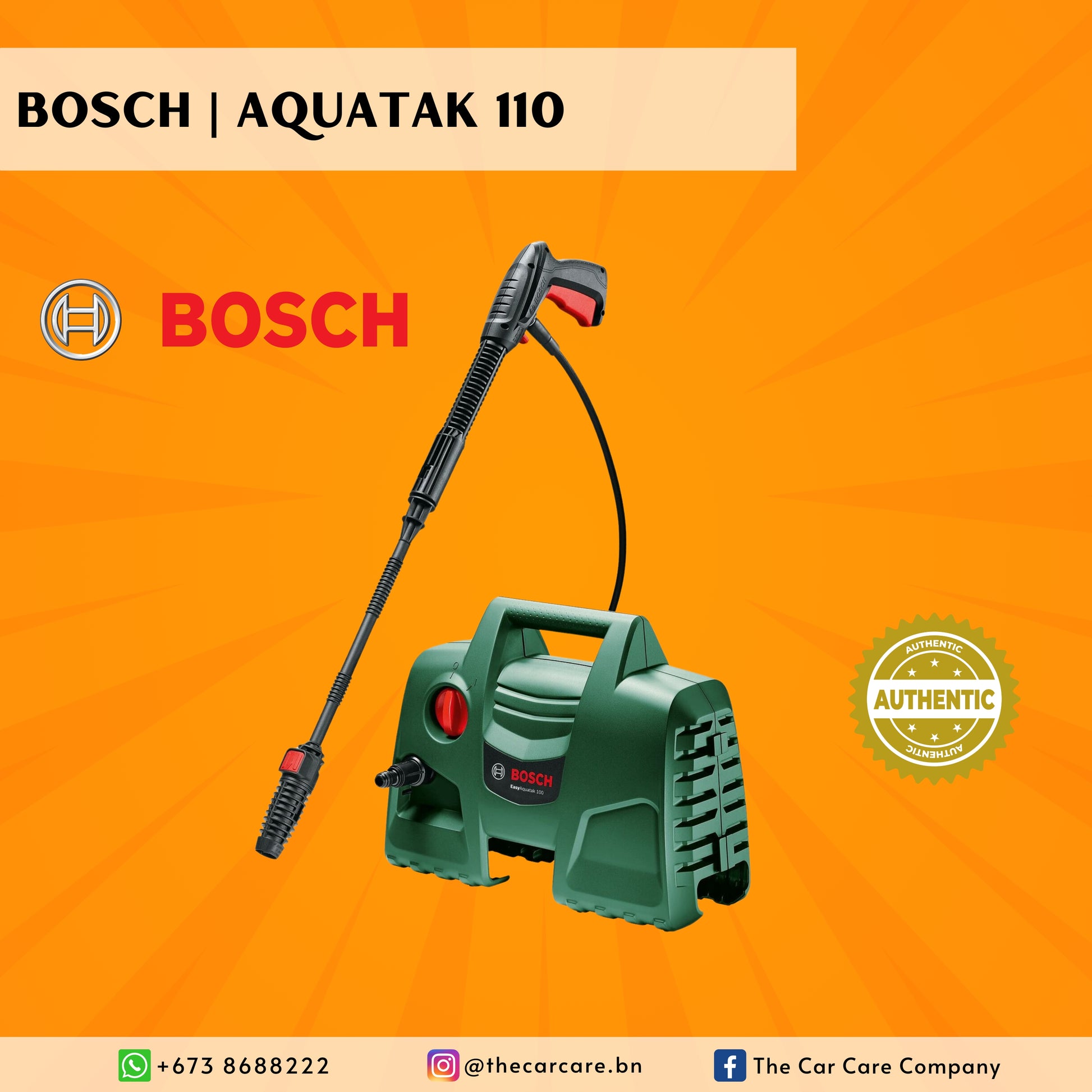 Bosch High Pressure Washer AQUATAK 110 is a highly efficient motor pump producing quick and effortless cleaning performance. It is compact, portable design with a broad base for extra stability and storage for all accessories. The simple push fit connections for quick and easy set up. The packaging includes variable power and rotary nozzles for deeper cleaning. The high-pressure detergent nozzle reduces cleaning time by quickly applying the soap. Most importantly, it is ready to use out of the box so no customer assembly required.