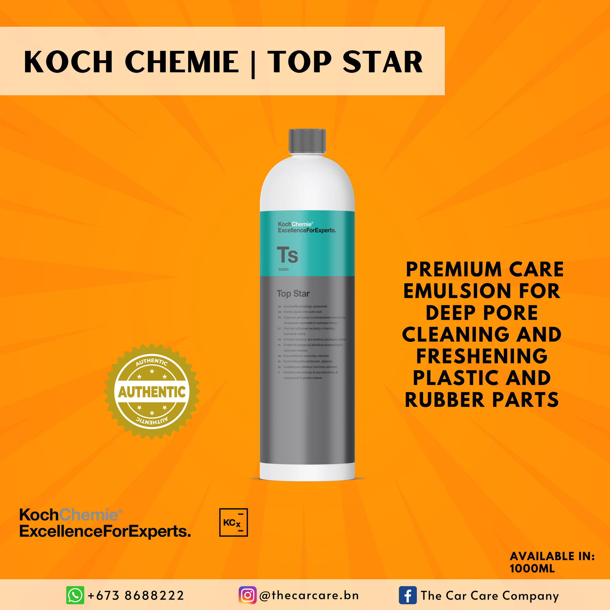 Premium care emulsion for deep pore cleaning and freshening plastic and rubber parts such as consoles, interior trim, seals, etc. Top Star creates a long-lasting, semigloss, natural sheen and protects the surface permanently against new dirt and UV radiation.