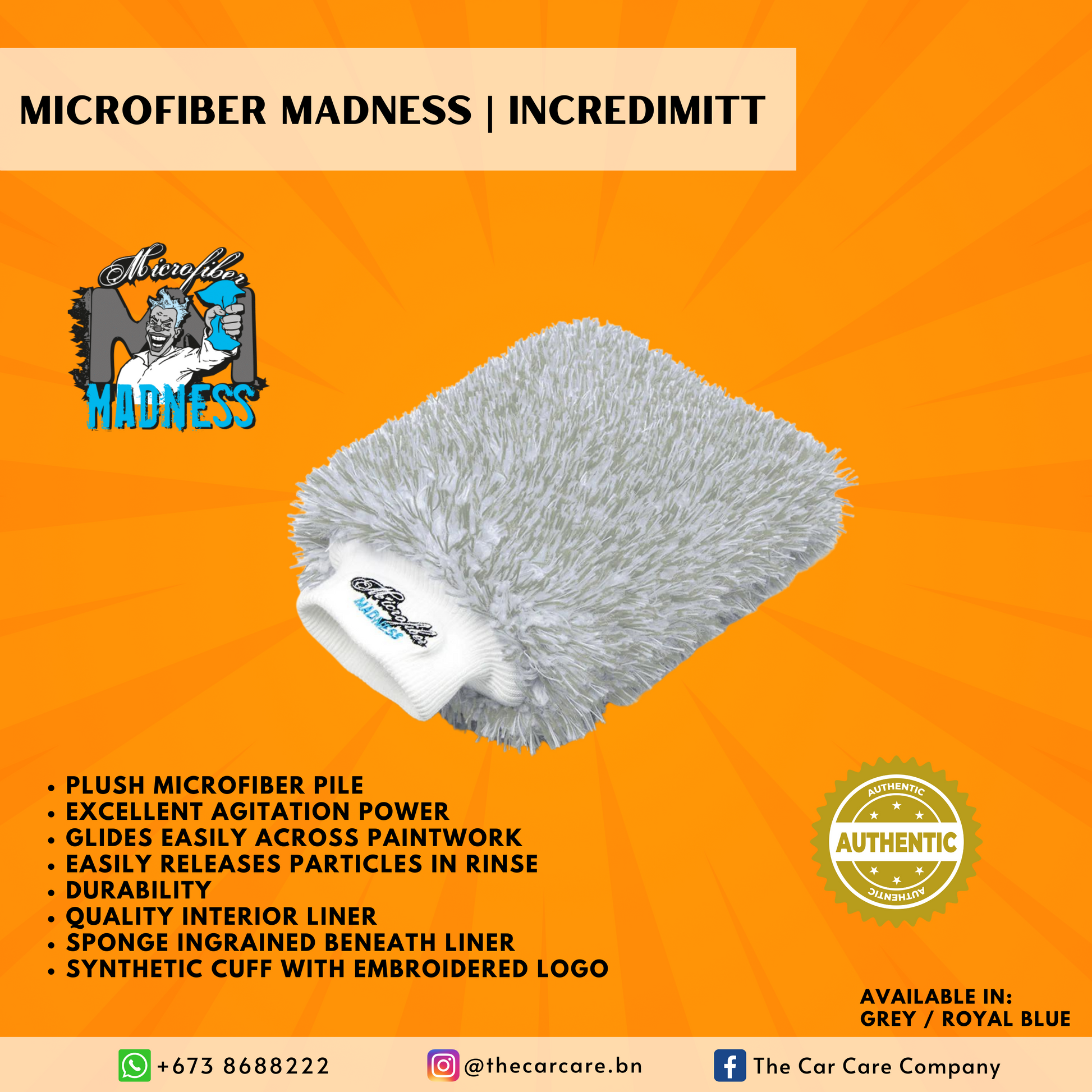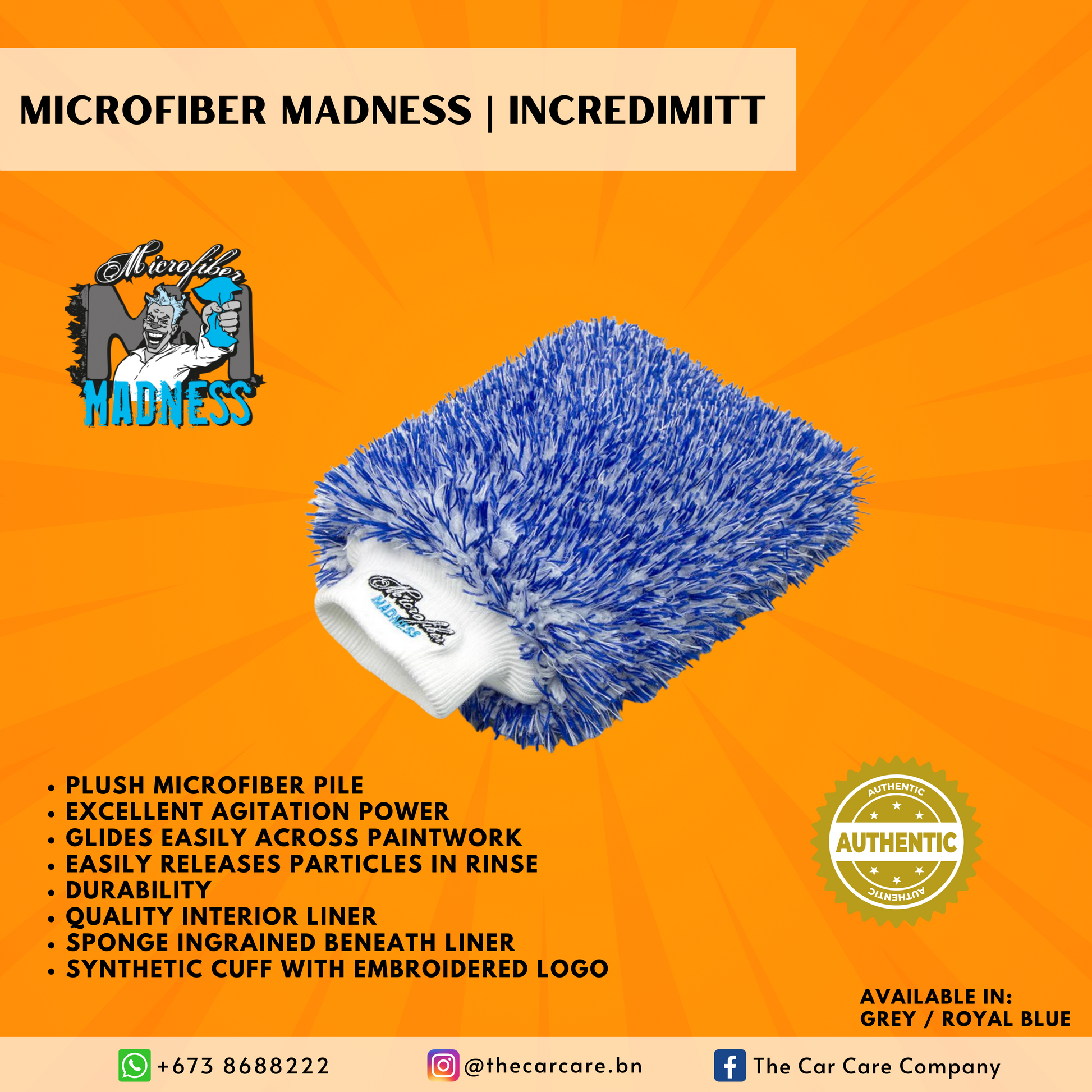 Microfiber Madness was prepared to redefine the term "quality microfiber wash mitt". It was then that Microfiber Madness released the premium microfiber "Incredimitt". The Incredimitt merges the best of both wash mitt theories. Utilizing the well know cleansing abilities of microfiber, they created a special fiber blend enabling a thick "pile" to be created similar to those typically found in premium quality wool wash mitts. The Incredimitt features a thick plush pile of ultra-soft but dense microfibers designed for even the most finicky enthusiasts and professionals worldwide.